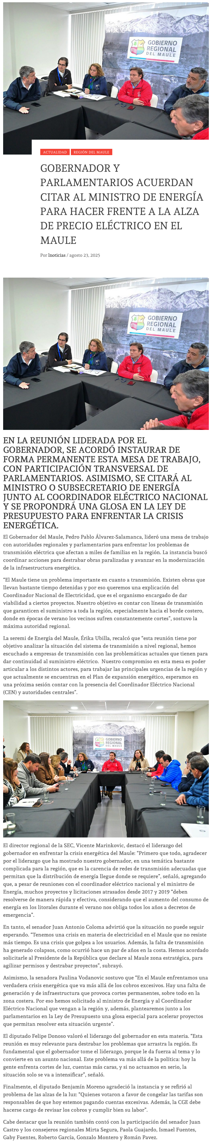 Gobernador y parlamentarios acuerdan citar al ministro de Energía para hacer frente a la crisis de infraestructura eléctrica en el Maule - (El Heraldo (Linares))