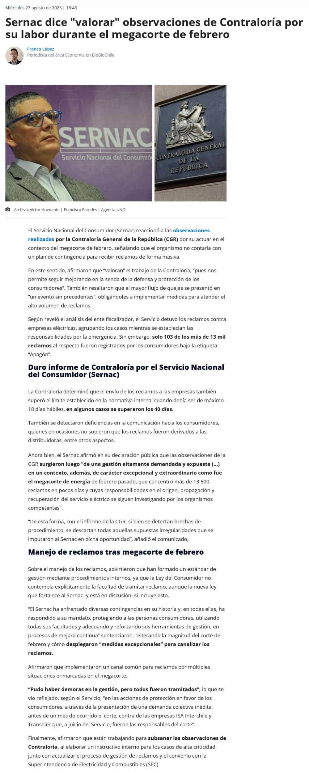 Sernac responde a informe de Contraloría por mega apagón - (estapasando.cl)