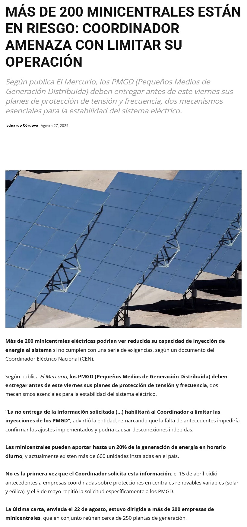 Más de 200 minicentrales eléctricas arriesgan recorte de inyección al sistema si no entregan planes de protección antes del viernes - (puranoticia.cl)