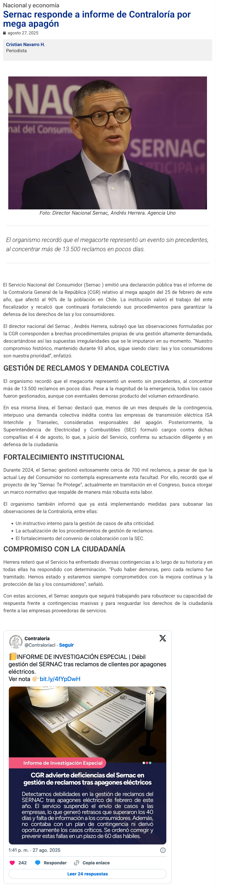 Sernac dice "valorar" observaciones de Contraloría por su labor durante el megacorte de febrero - (biobiochile online)