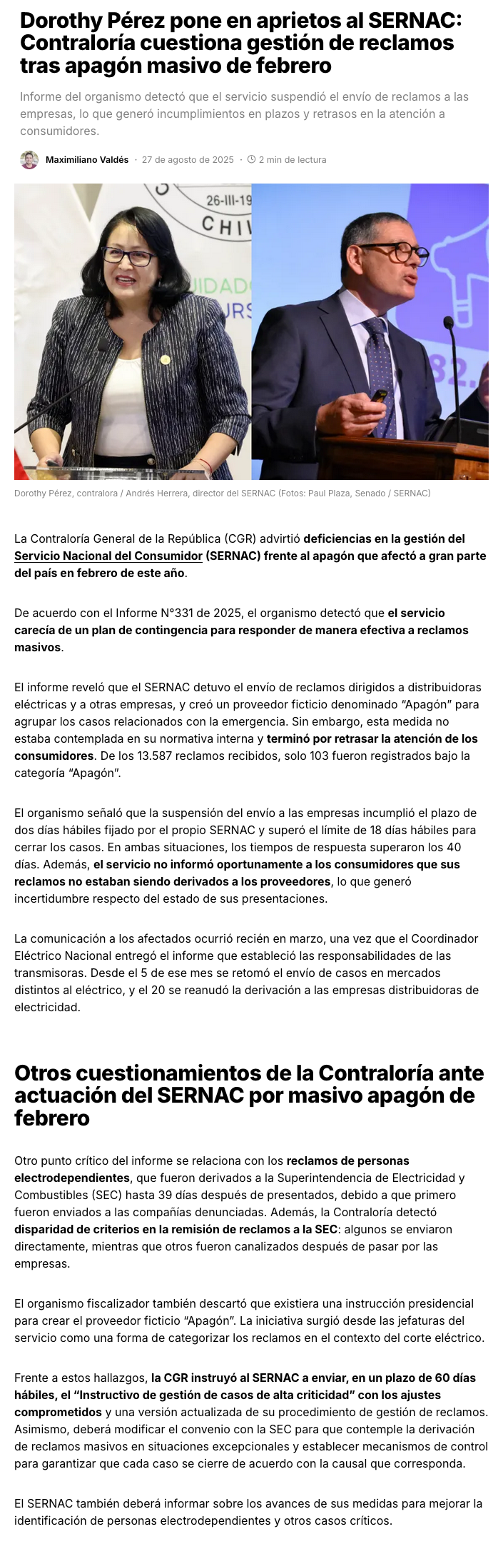 Dorothy Pérez pone en aprietos al Sernac: Contraloría cuestiona gestión de reclamos por apagón 25F - (El Mostrador)