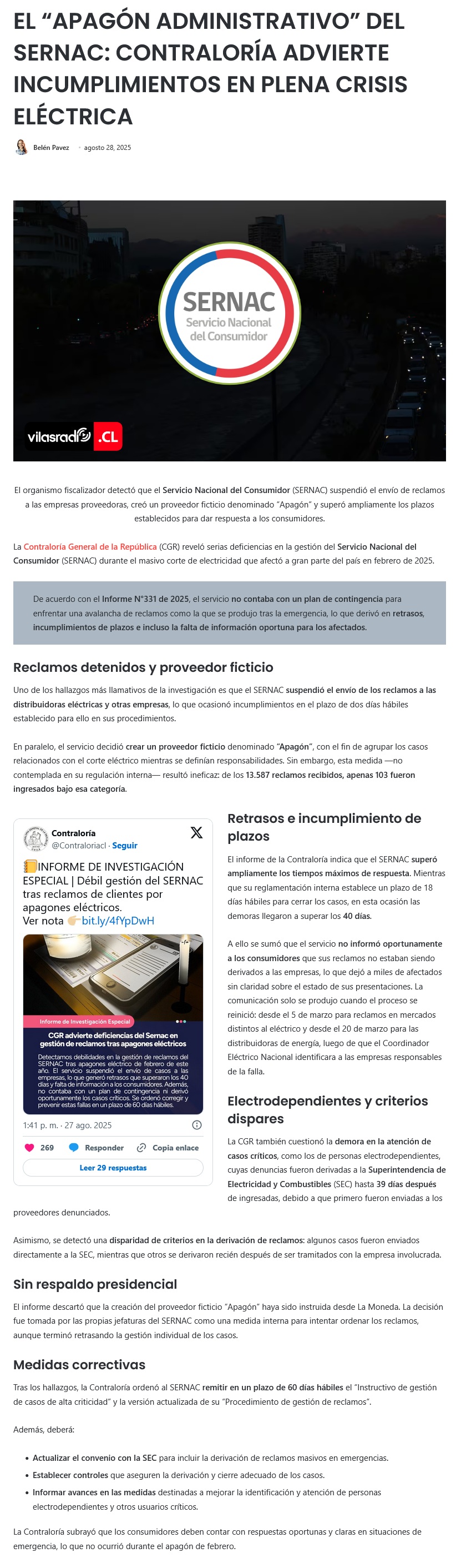 Contraloría advierte deficiente gestión del Sernac ante reclamos de clientes por mega apagón de febrero - (radiopaulina.cl)