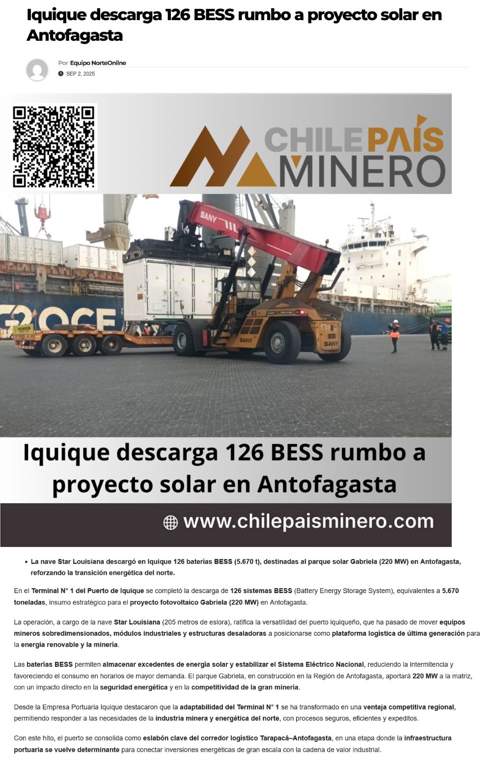 En puerto de Iquique recala nave con baterías Bess para proyecto energético de Antofagasta - (El Longino de Iquique)