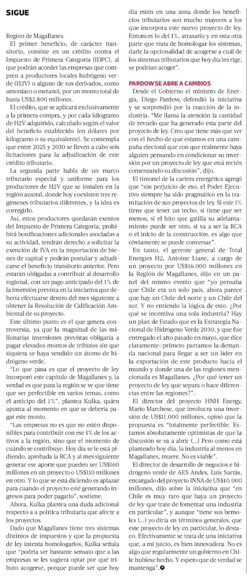 Pardow se abre a cambiar pago adelantado en el hidrógeno verde - (El Mercurio de Santiago)