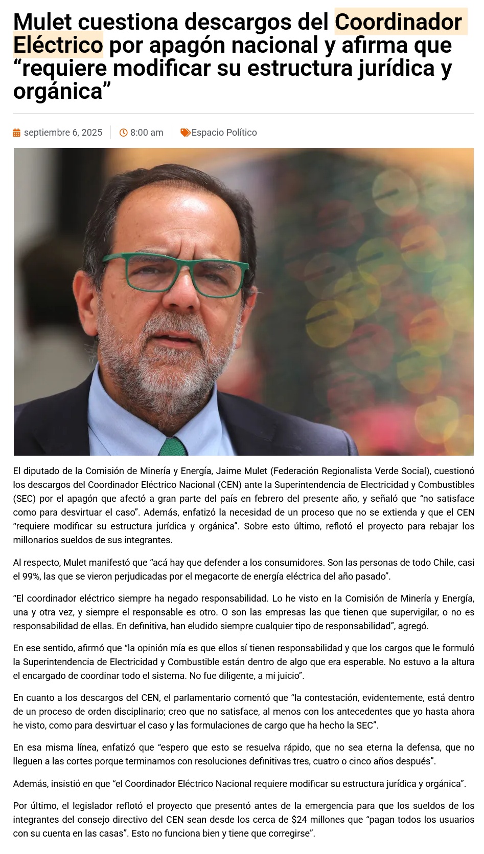 Mulet cuestiona descargos del Coordinador Eléctrico por apagón nacional y afirma que “requiere modificar su estructura jurídica y orgánica” - (chanarcillo.cl)