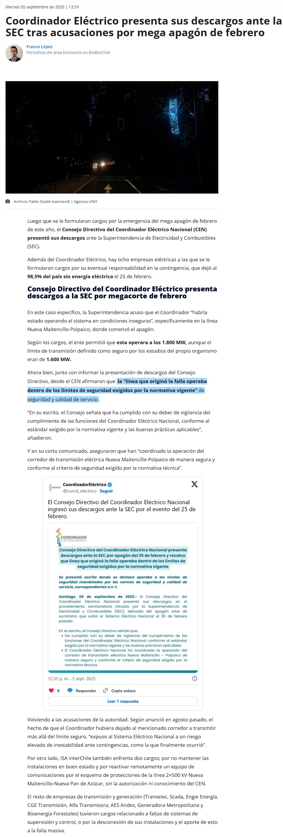Consejo del Coordinador Eléctrico se defiende de cargos de la SEC por el gran apagón: dice que operaba bajo límites seguros - (La Tercera Online)