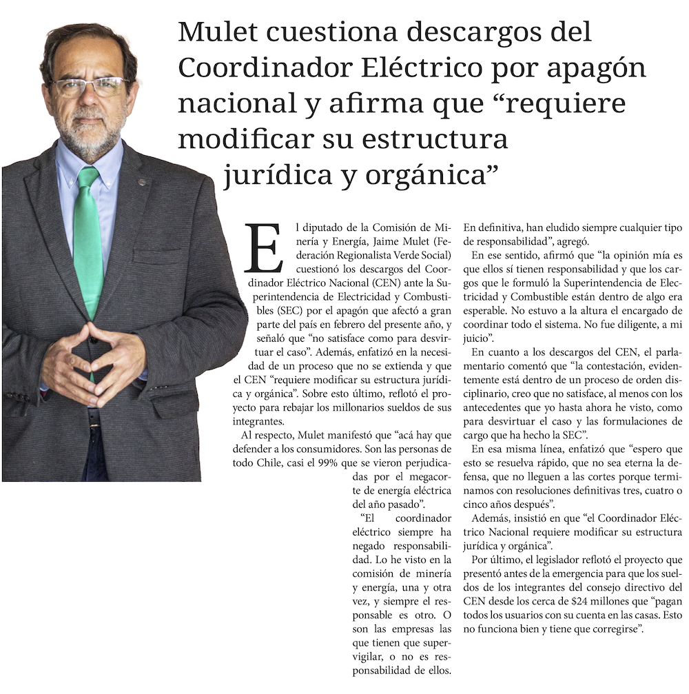 Mulet cuestiona descargos del Coordinador Eléctrico por apagón nacional y afirma que “requiere modificar su estructura jurídica y orgánica” - (elzorronortino.cl)