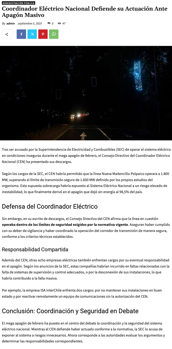 Consejo Directivo del Coordinador Eléctrico Nacional presenta descargos ante la SEC por apagón del 25 de febrero - (g5noticias.cl)