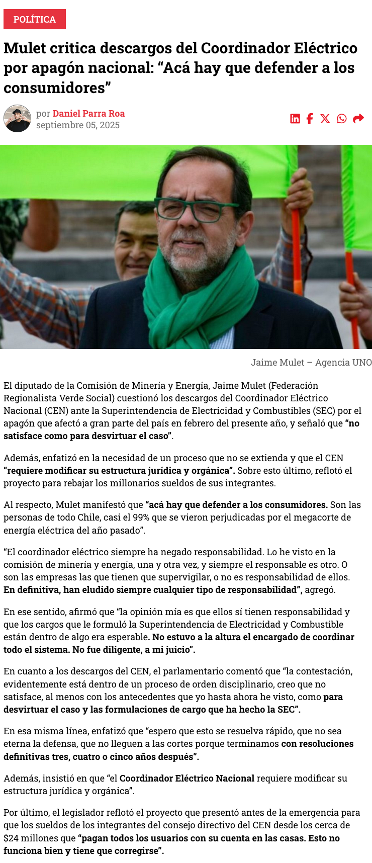 Mulet cuestiona descargos del Coordinador Eléctrico por apagón nacional y afirma que “requiere modificar su estructura jurídica y orgánica” - (elzorronortino.cl)