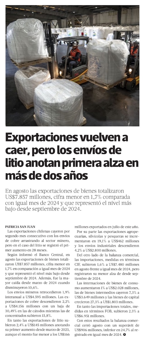 Exportaciones suman segunda baja y litio deja atrás dos años en rojo - (Diario Financiero)