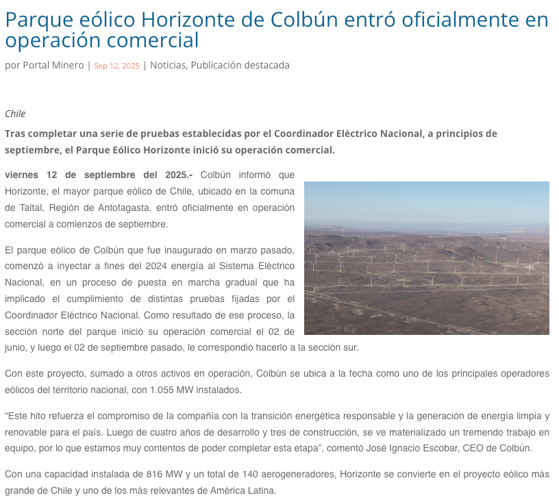 El Horizonte de Colbún: el mayor parque eólico de Chile entra en operación comercial - (redimin)