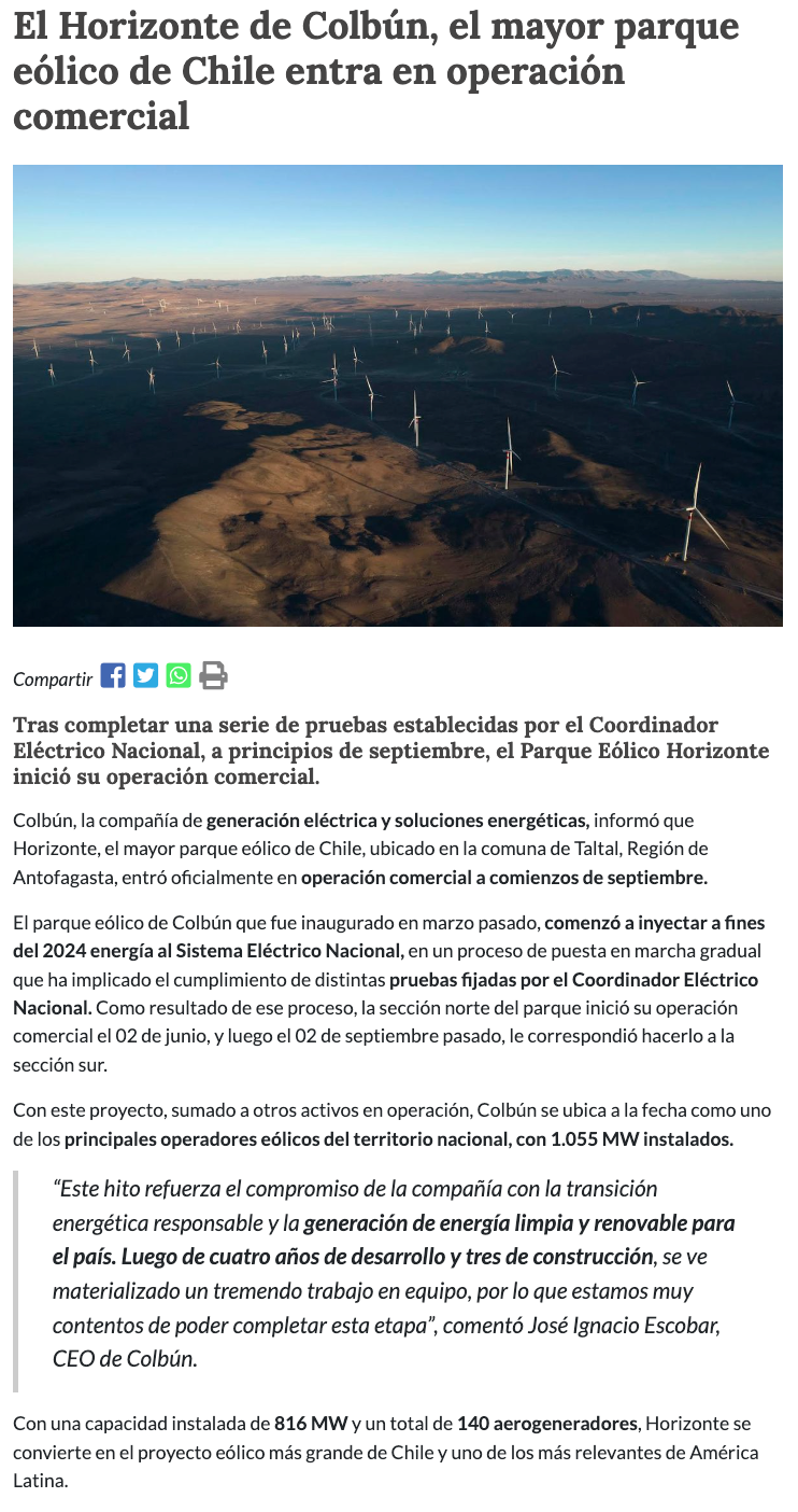 El Horizonte de Colbún: el mayor parque eólico de Chile entra en operación comercial - (redimin)