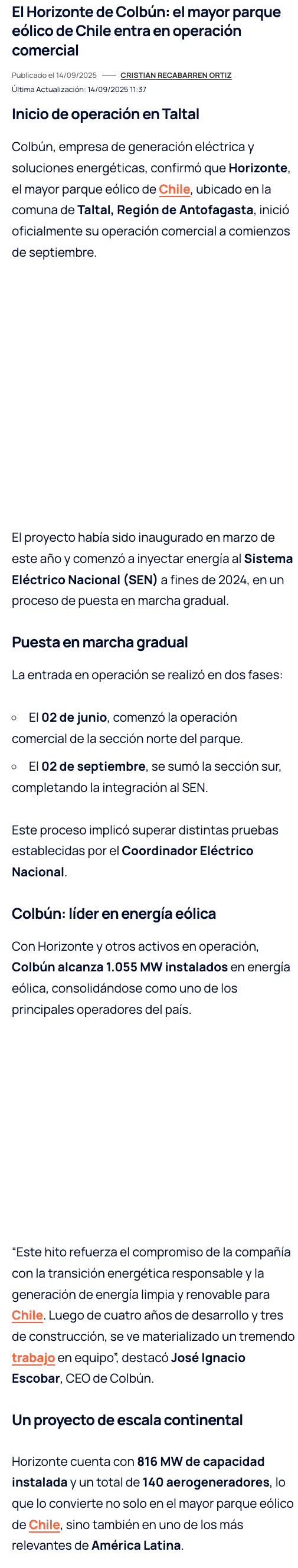 El Horizonte de Colbún, el mayor parque eólico de Chile entra en operación comercial - (reporteminero)