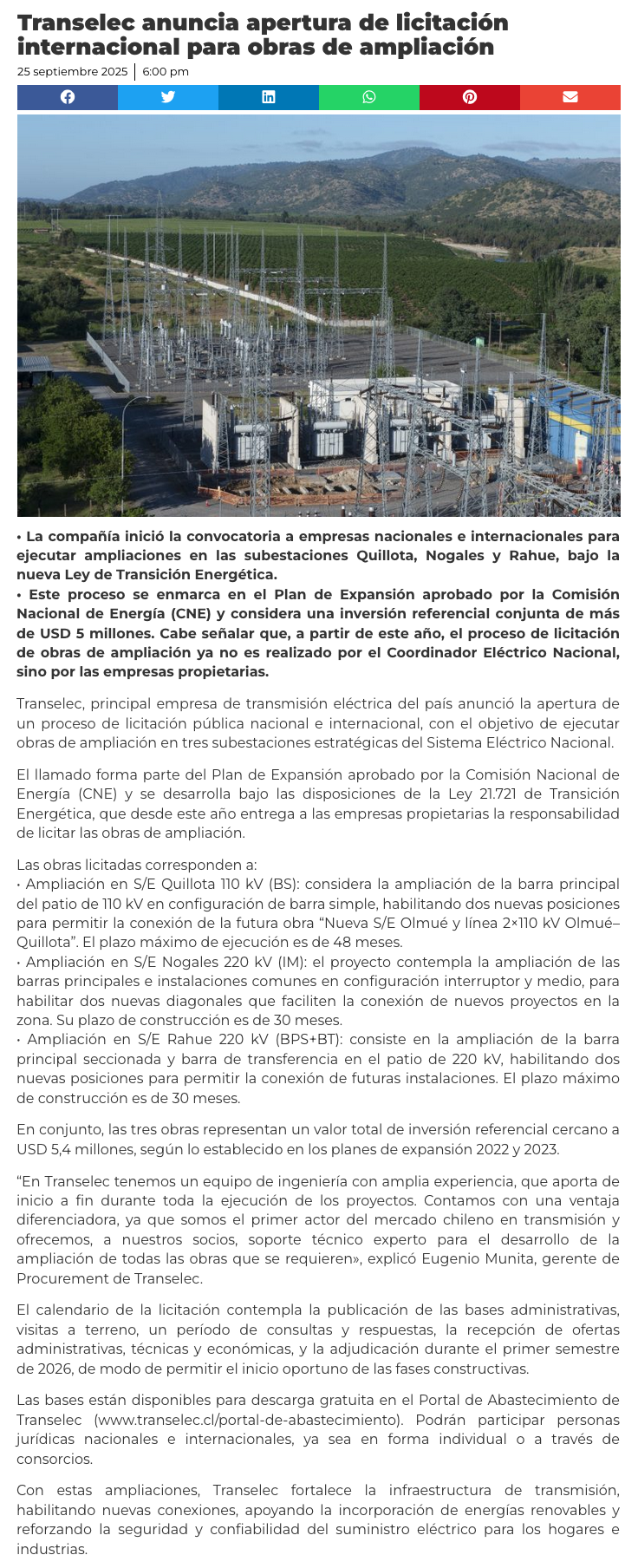 Transelec lanza licitación pública nacional e internacional para obras de ampliación en tres subestaciones del SEN - (electromineria.cl)