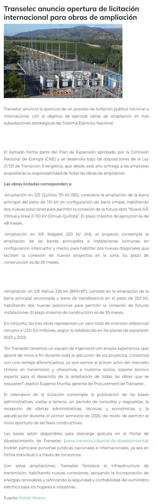 Transelec anuncia apertura de licitación internacional para obras de ampliación - (portalinnova.cl)