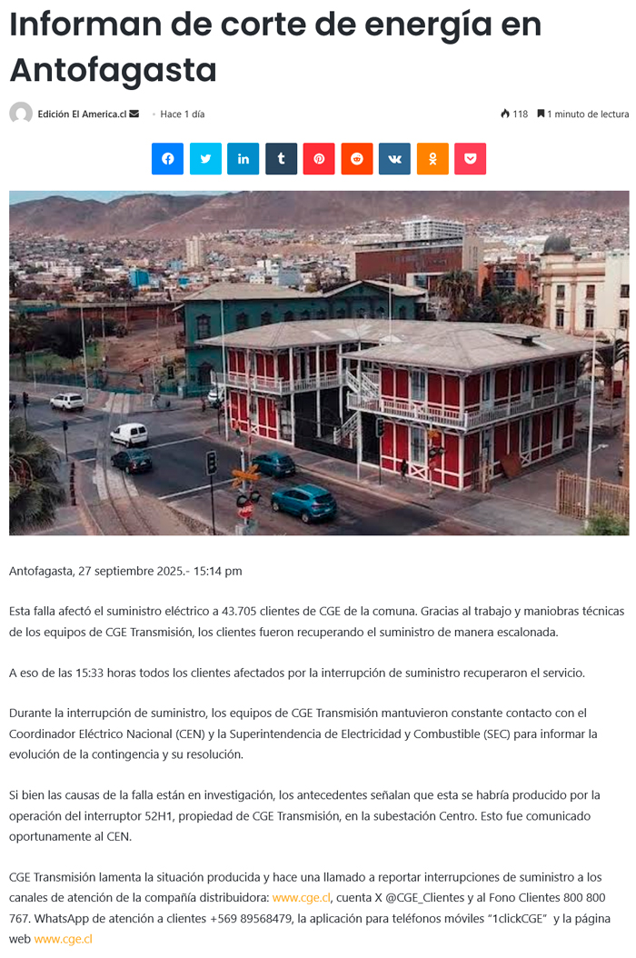 Corte de luz en Antofagasta: CGE detalla sobre la falla de hoy viernes 26 de septiembre - (elnortero)