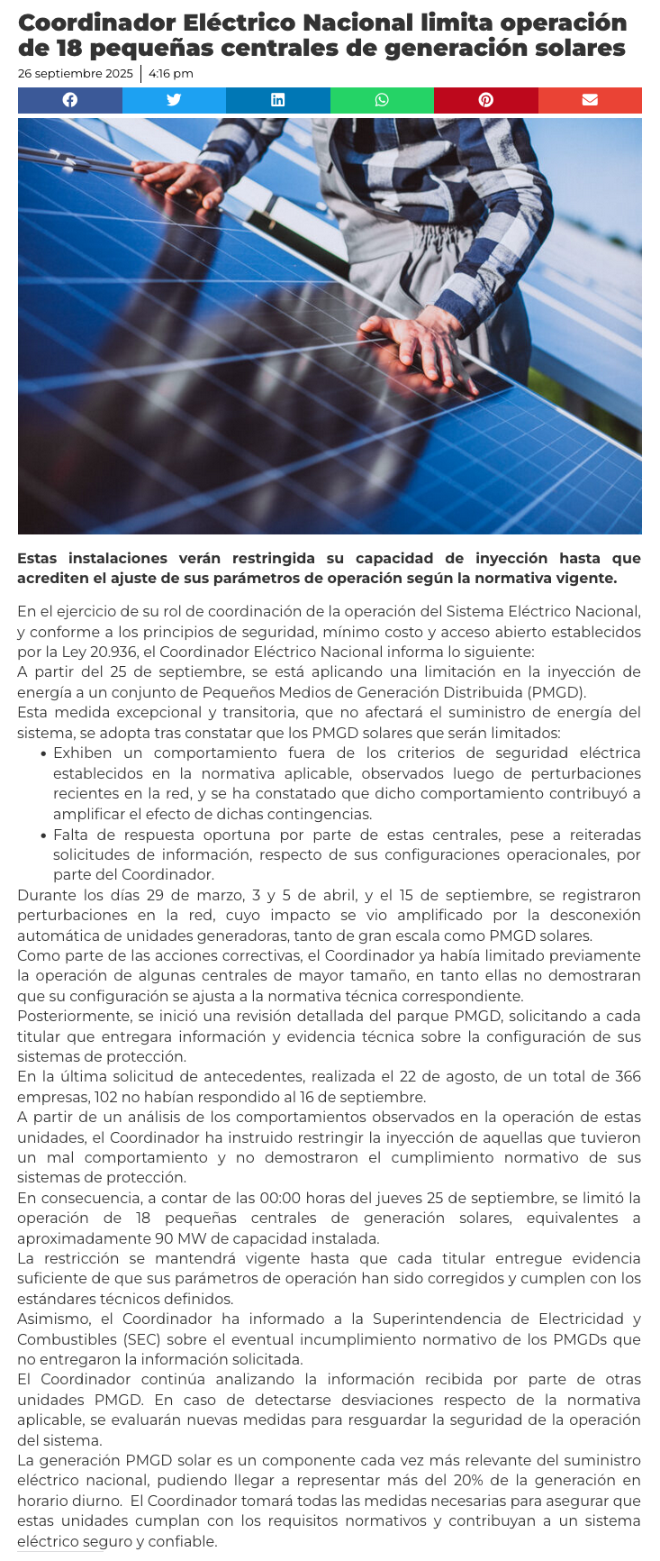Coordinador Eléctrico Nacional limita 17 pequeñas centrales solares por posibles fallas - (puranoticia.cl)