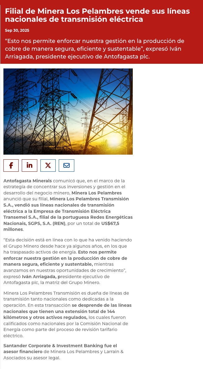 Filial de Minera Los Pelambres vende sus líneas nacionales de transmisión eléctrica - (portalminero)