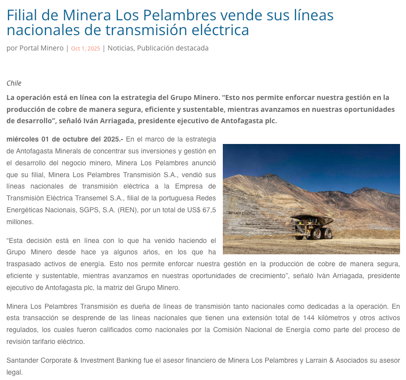 Filial de Minera Los Pelambres vende sus líneas nacionales de transmisión eléctrica - (mch.cl)