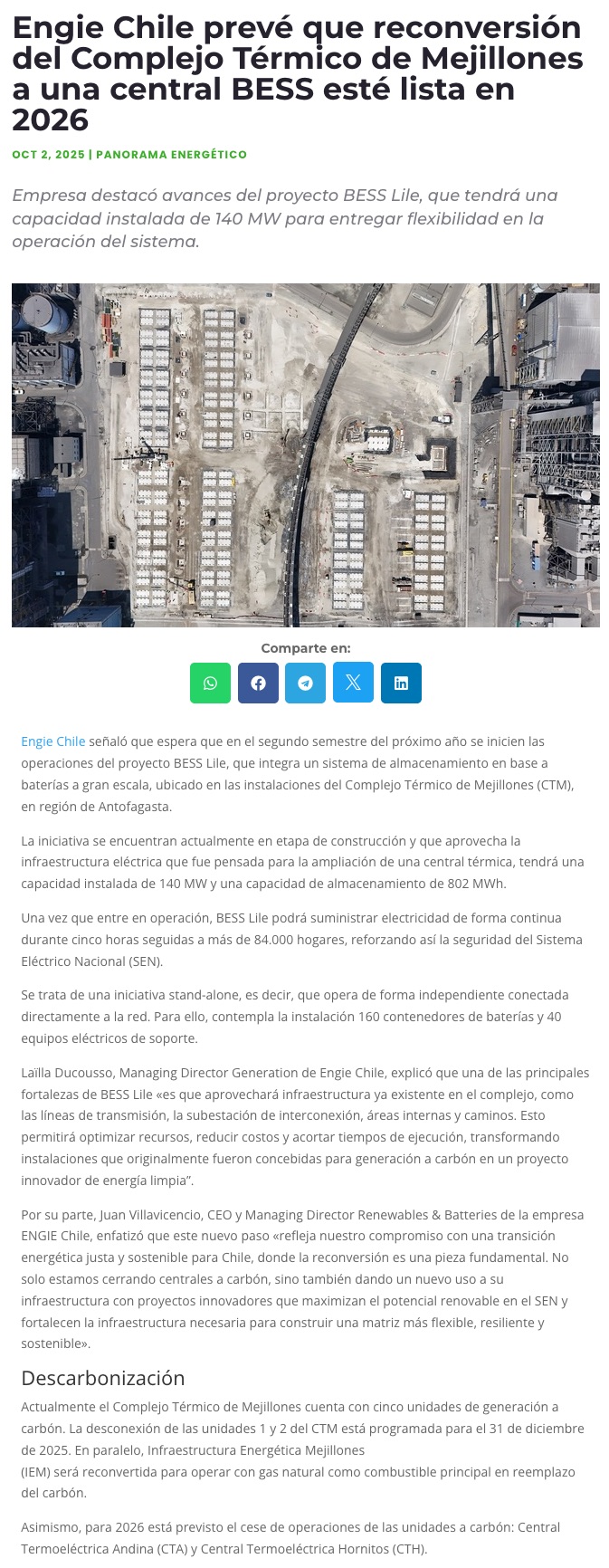 Engie impulsa proyecto de almacenamiento BESS Lile en Complejo Térmico de Mejillones - (El Mercurio de Calama)