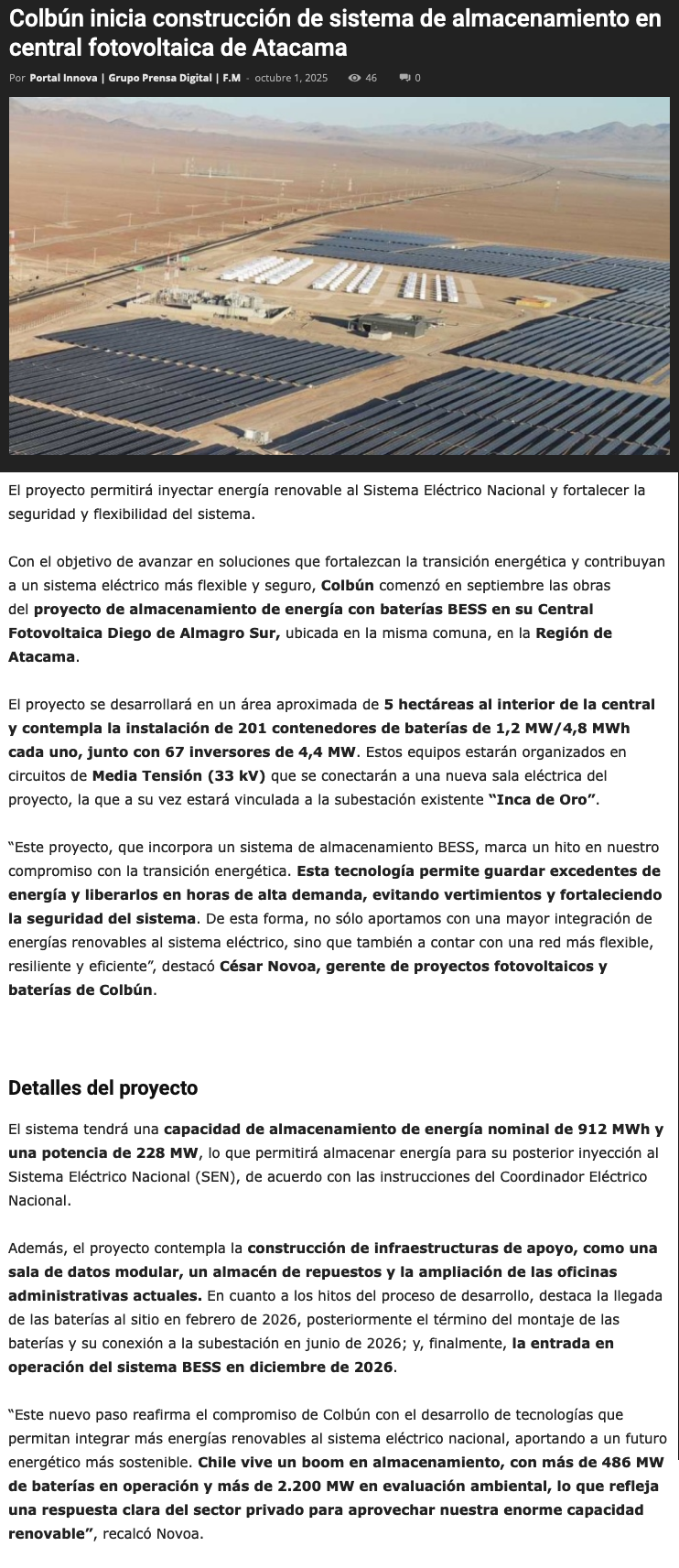 Colbún inicia construcción de sistema de almacenamiento con baterías BESS en su Central Diego de Almagro Sur - (norteyenegia.cl)