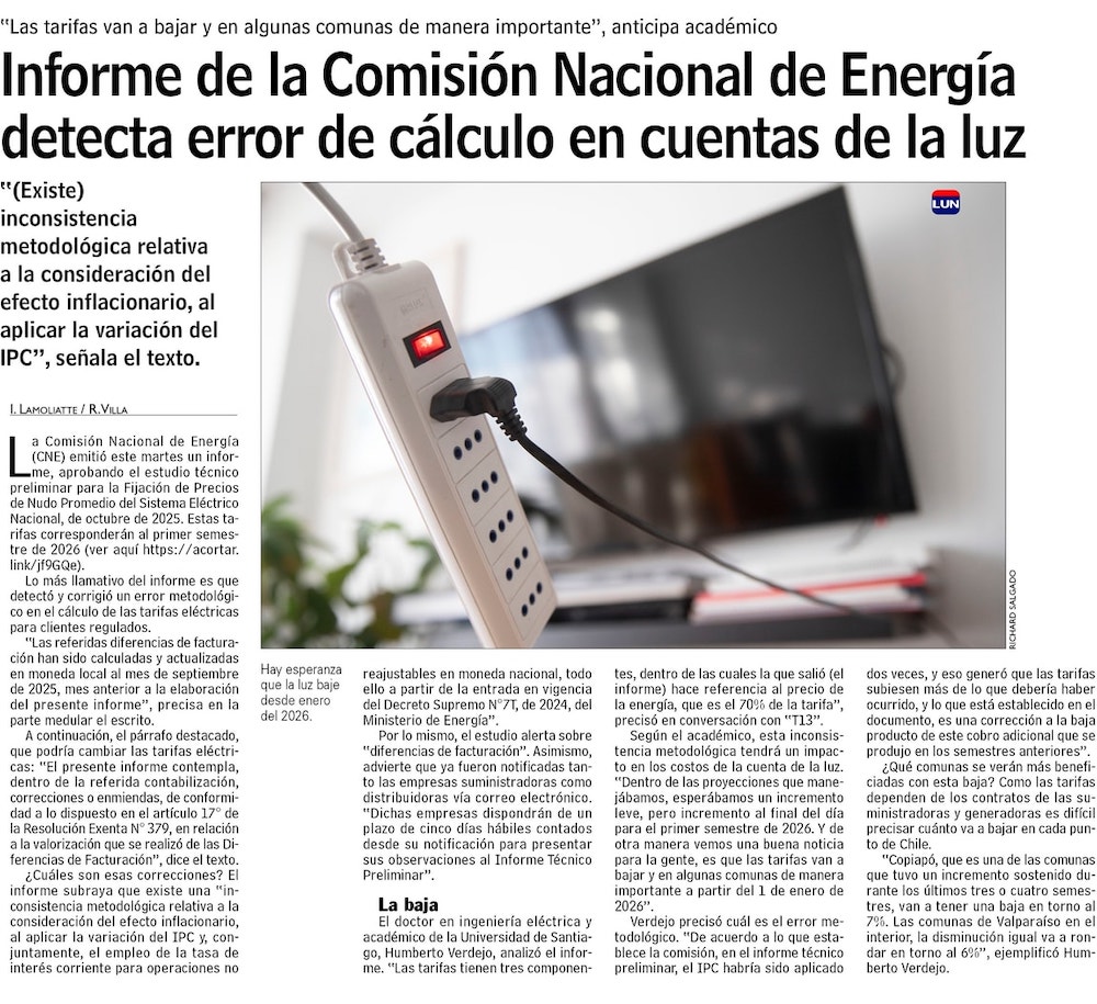 Comisión Nacional de Energía detecta error de cálculo en la cuentas de luz: Tarifas bajarían en enero de 2026 - (emol)