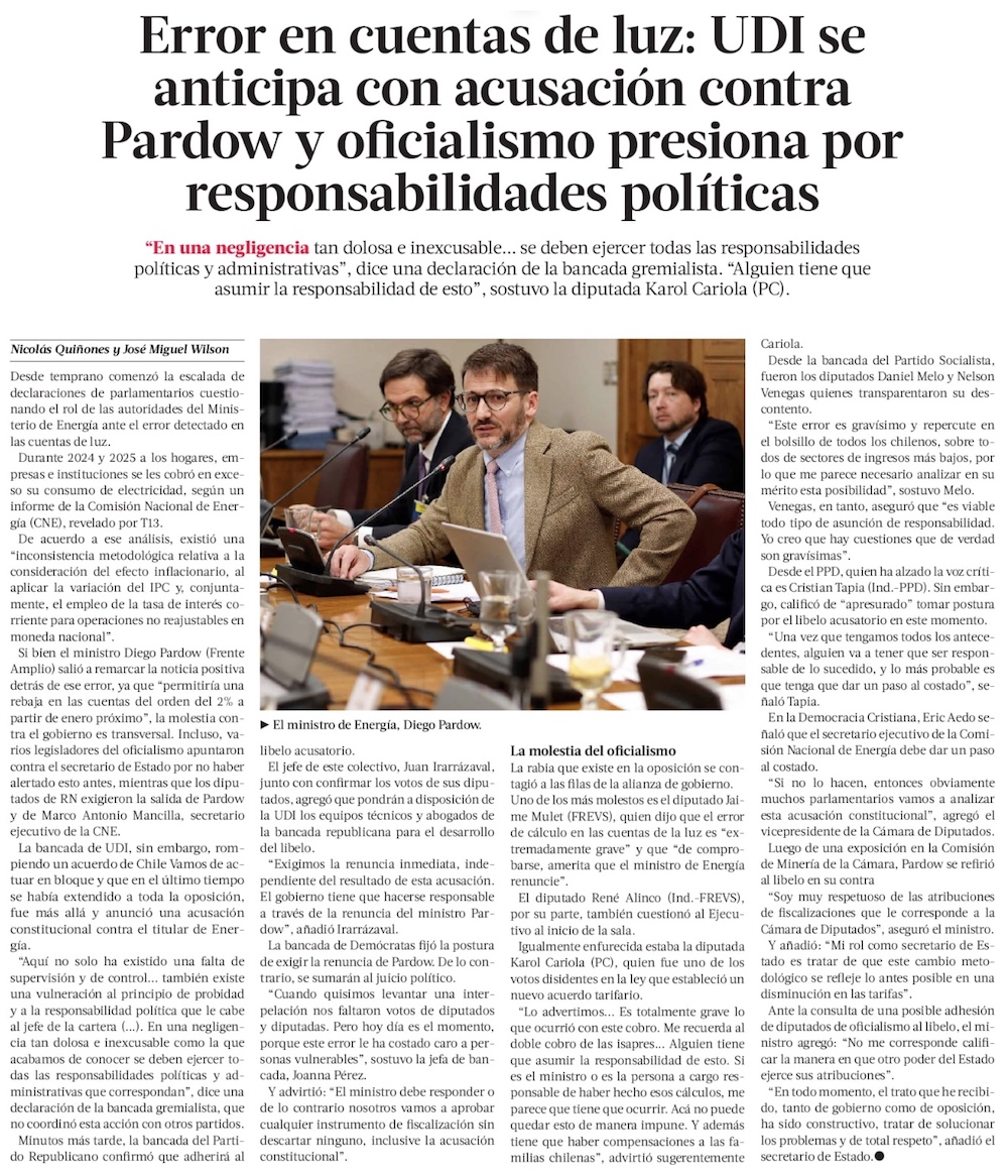 Oposición anuncia AC contra ministro Pardow por grave error en cuentas de luz - (Medios Regionales Cadena El Mercurio)