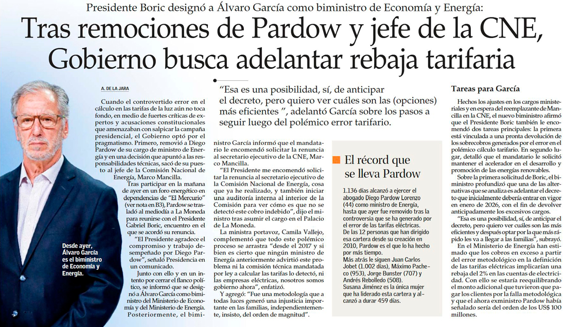 Inician auditoría por procesos de tarifas de la CNE - (El Mercurio de Santiago)
