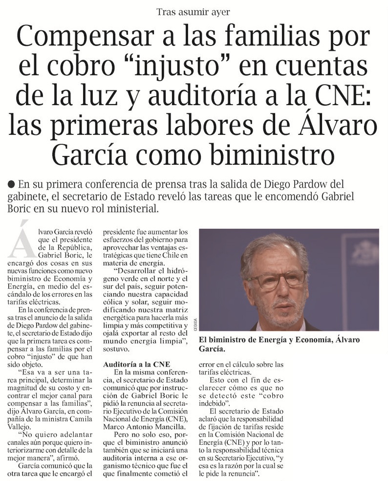 La posta energética que asume el ahora biministro Álvaro García - (Pulso)