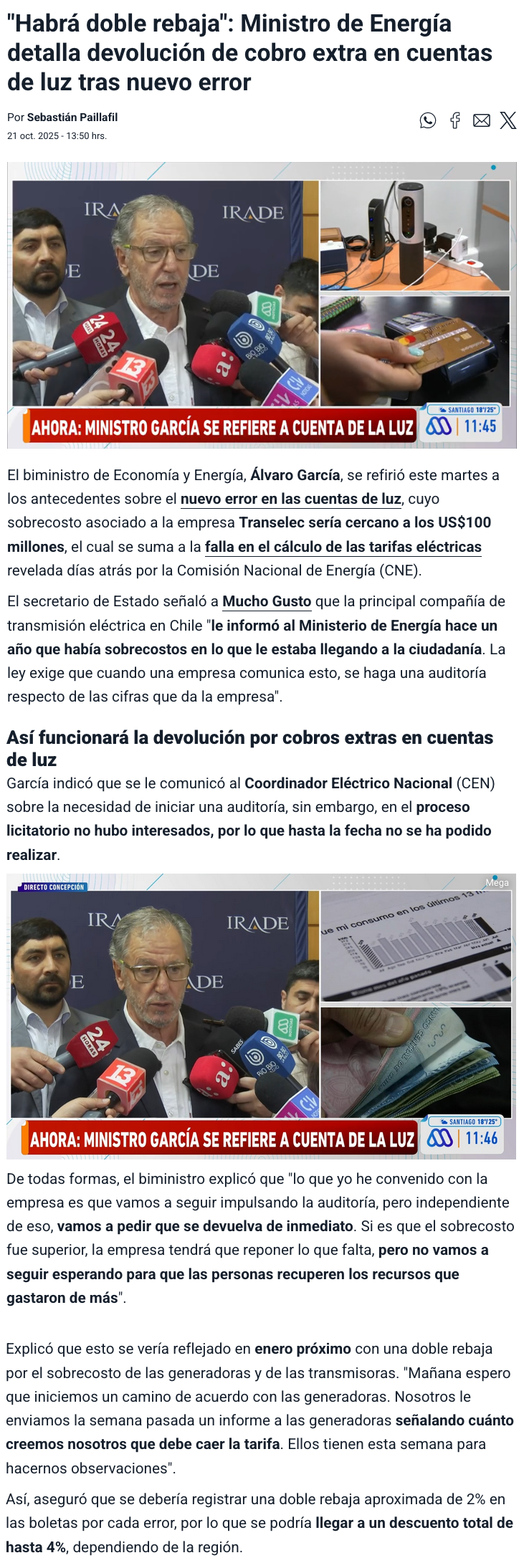 Biministro Álvaro García anuncia acuerdo con Transelec para devolver cobros adicionales en las cuentas de la luz - (publimetro.cl)