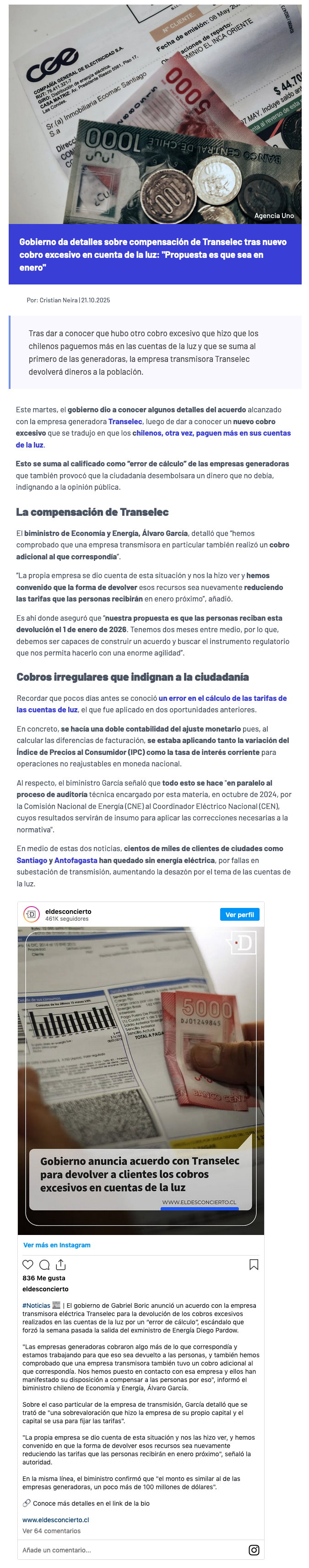 Gobierno confirma acuerdo con Transelec sobre devolución de cobros en exceso a clientes a través de rebajas en cuentas de luz - (puranoticia.cl)