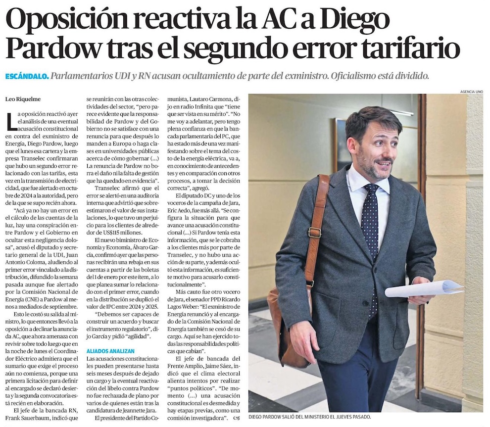 Oposición reactiva la AC a Pardow tras el segundo error tarifario - (Medios Regionales Cadena El Mercurio)