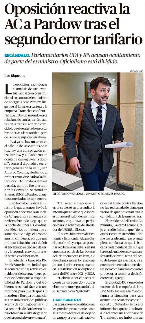 Oposición reactiva la AC a Pardow tras el segundo error tarifario - (Medios Regionales Cadena El Mercurio)