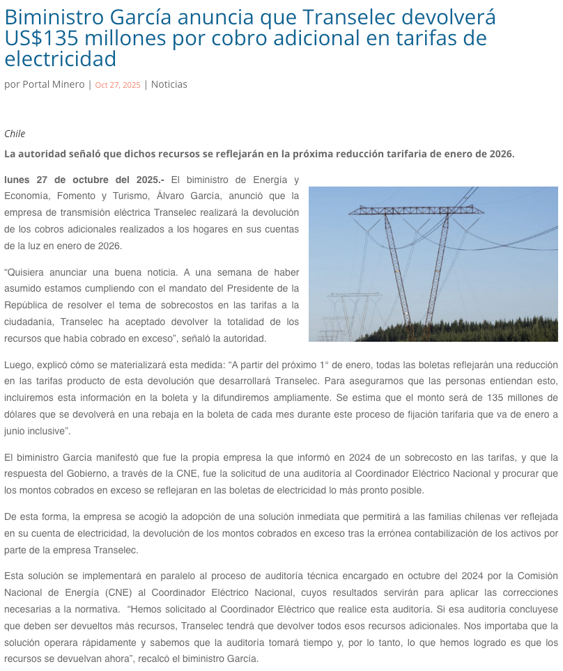 Transelec devolverá 135 millones de dólares por cobros indebidos en electricidad - (redimin)