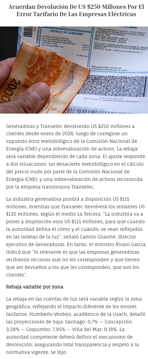 “El acuerdo está cerrado”: Gobierno confirma devolución de $2.000 mensuales por seis meses en cuentas de luz a partir de 2026 - (eldesconcierto)