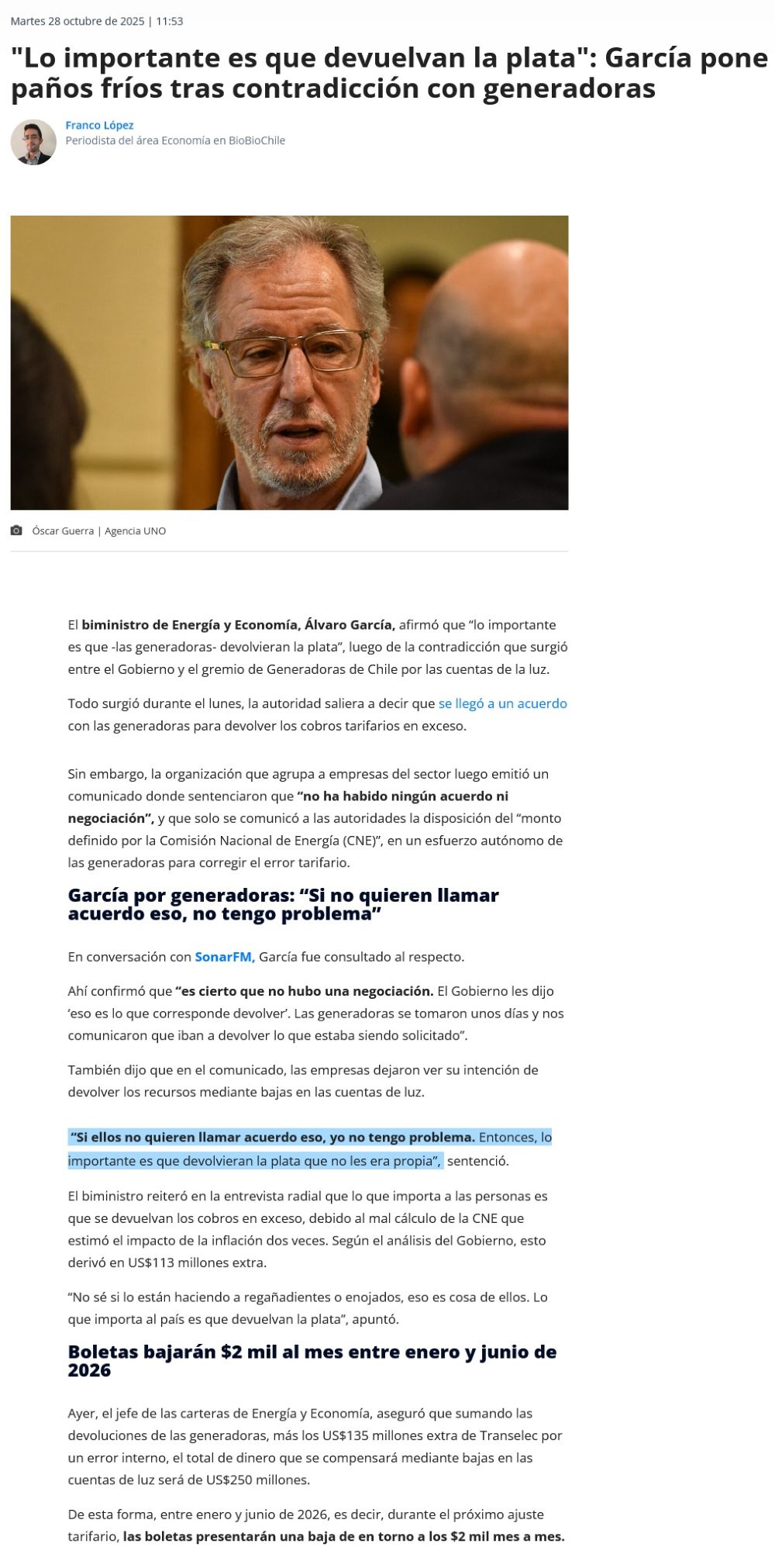 Biministro García reafirma que generadoras devolverán sobrecobros: "Si ellos no quieren llamar acuerdo a eso, yo no tengo problemas" - (DF Online)