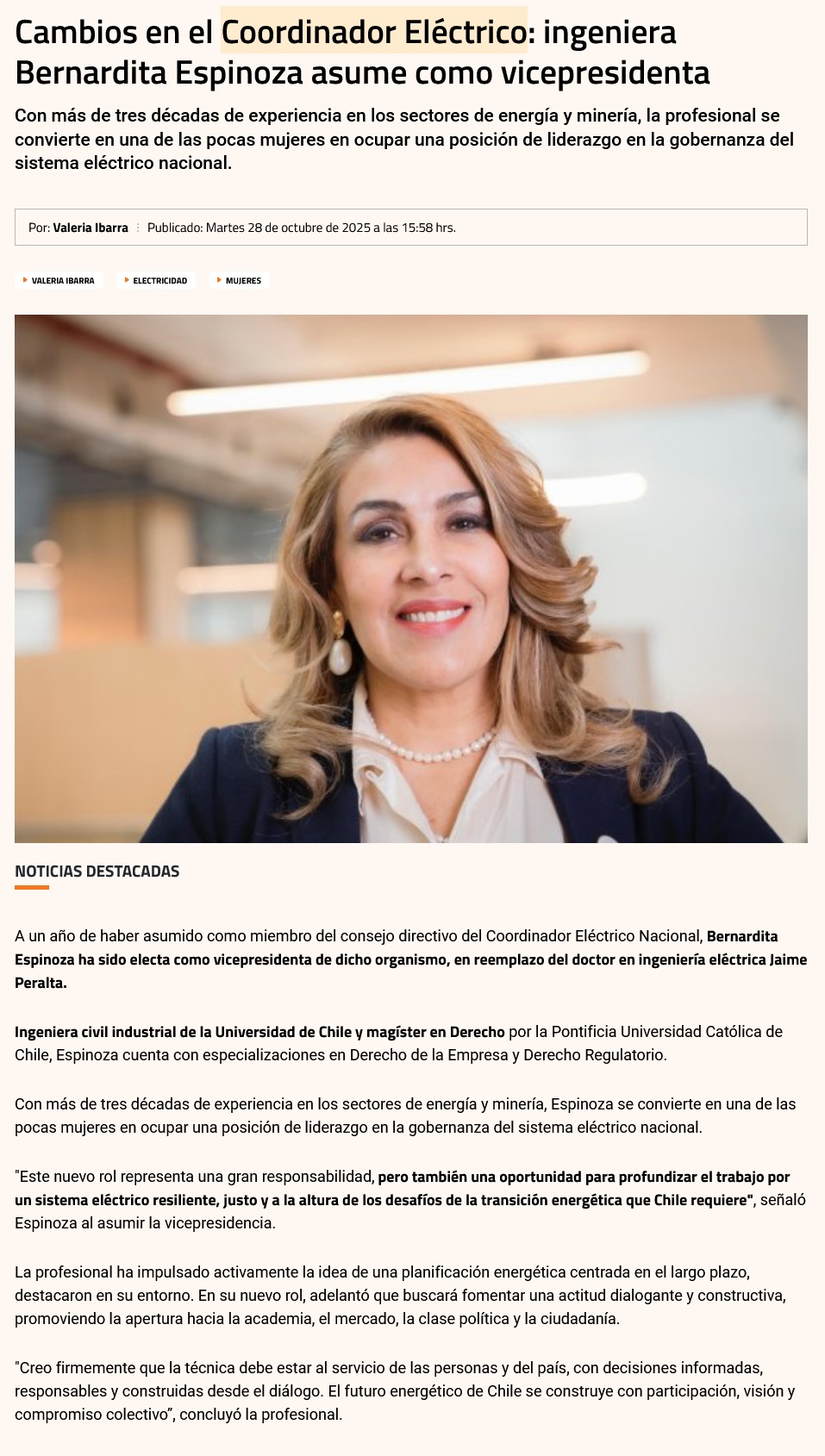 Bernardita Espinoza asumió como vicepresidenta del Consejo Directivo del Coordinador Eléctrico Nacional - (electromineria.cl)