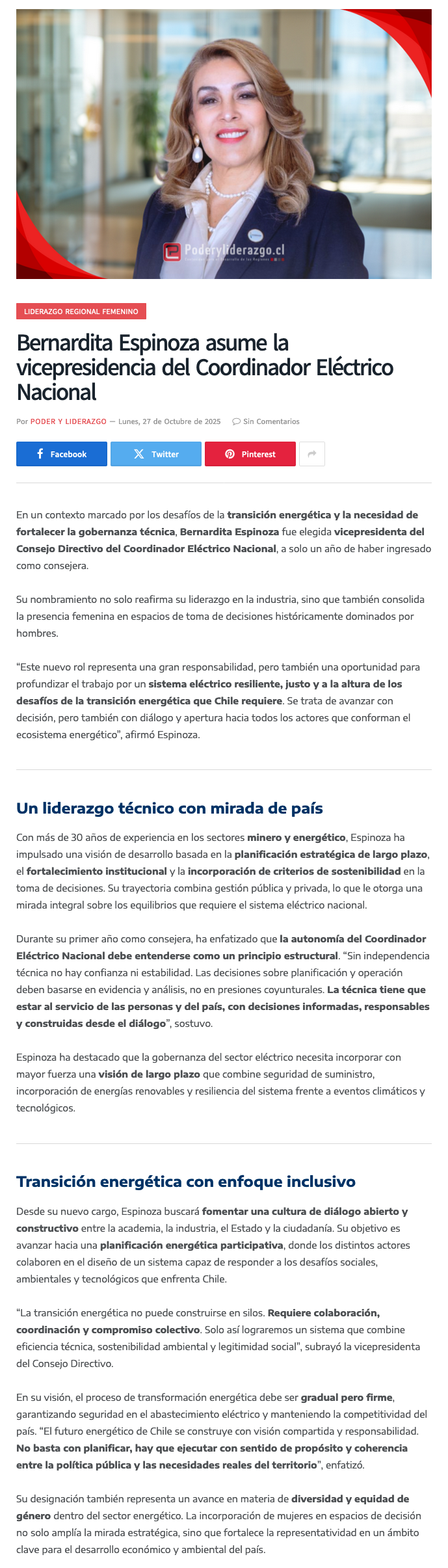 Cambios en el Coordinador Eléctrico: ingeniera Bernardita Espinoza asume como vicepresidenta - (DF Online)