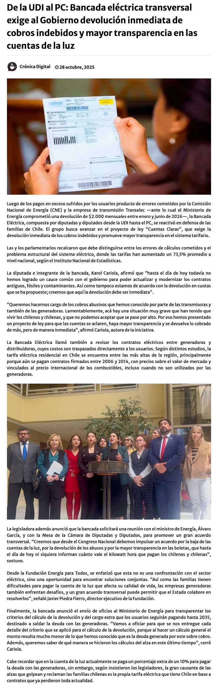 Bancada Eléctrica: desde la UDI al PC exigen devolución inmediata de cobros indebidos y más transparencia en cuentas de la luz - (puranoticia.cl)