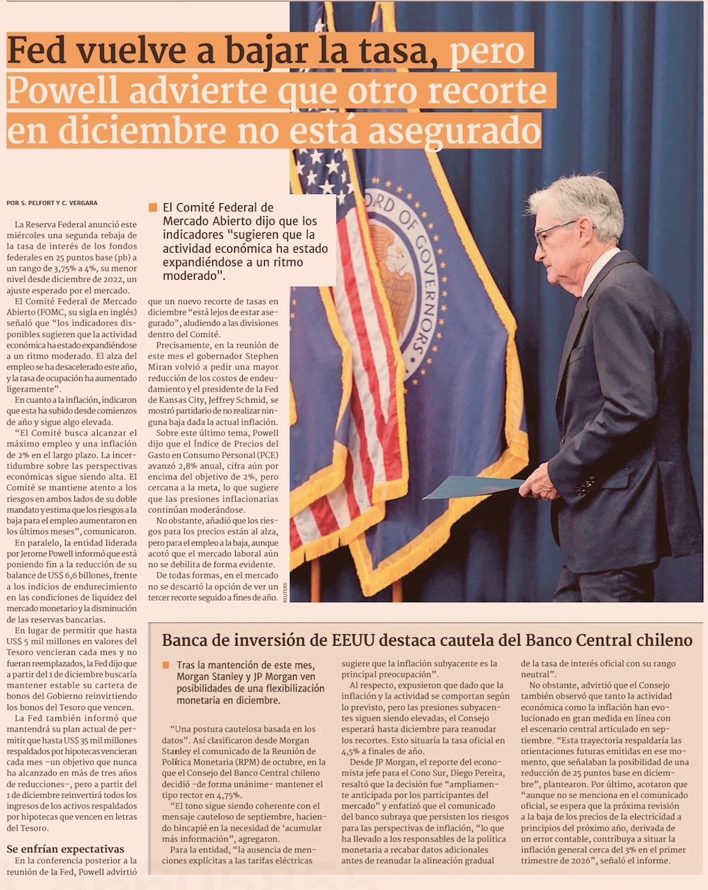 Fed vuelve a bajar la tasa de interés, pero Powell pone en duda nuevo recorte en diciembre - (Pulso)