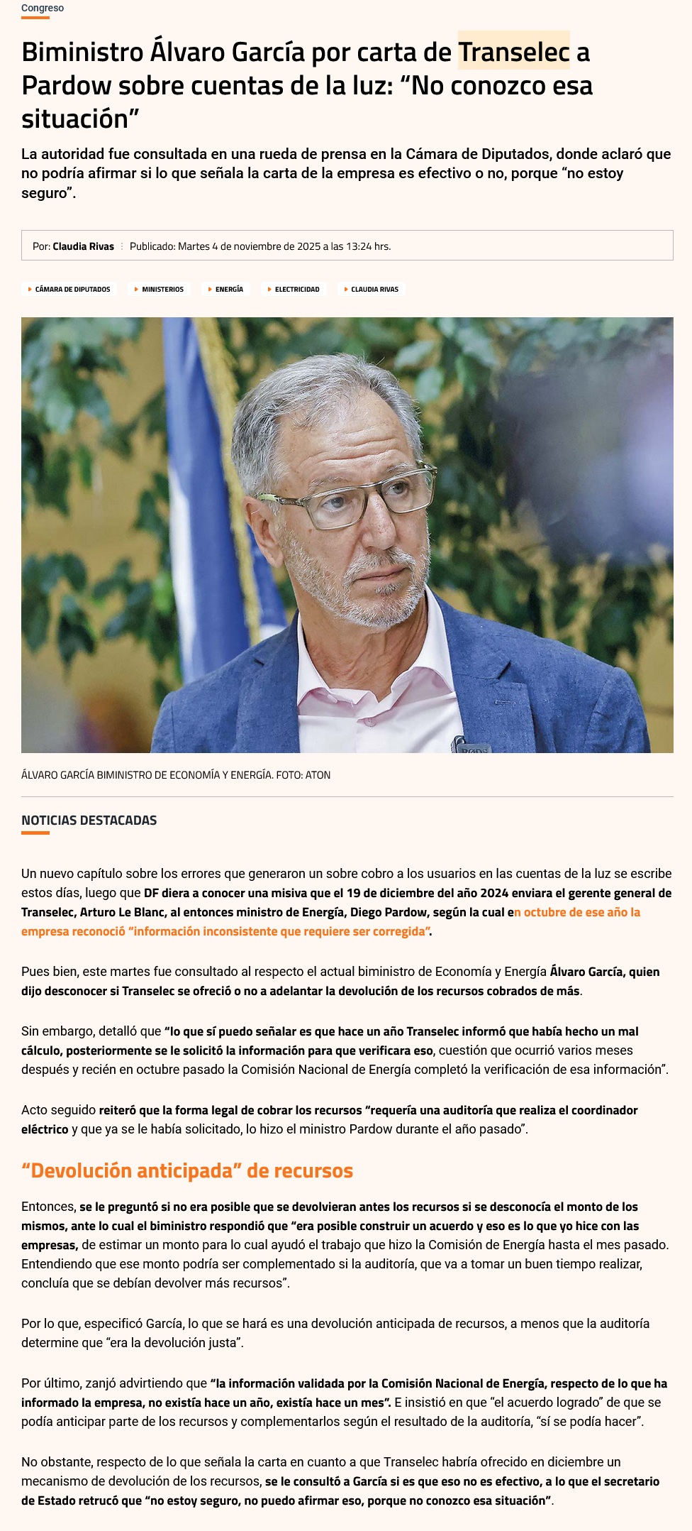 Ministro García dice "no estar seguro" de que Transelec ofreciera a Pardow devolver cobros en exceso hace un año - (emol)