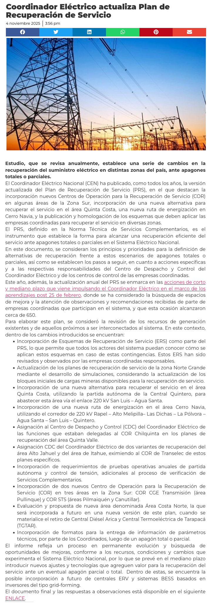 Coordinador Eléctrico Nacional actualiza Plan de Recuperación de Servicio - (revistaei.cl)