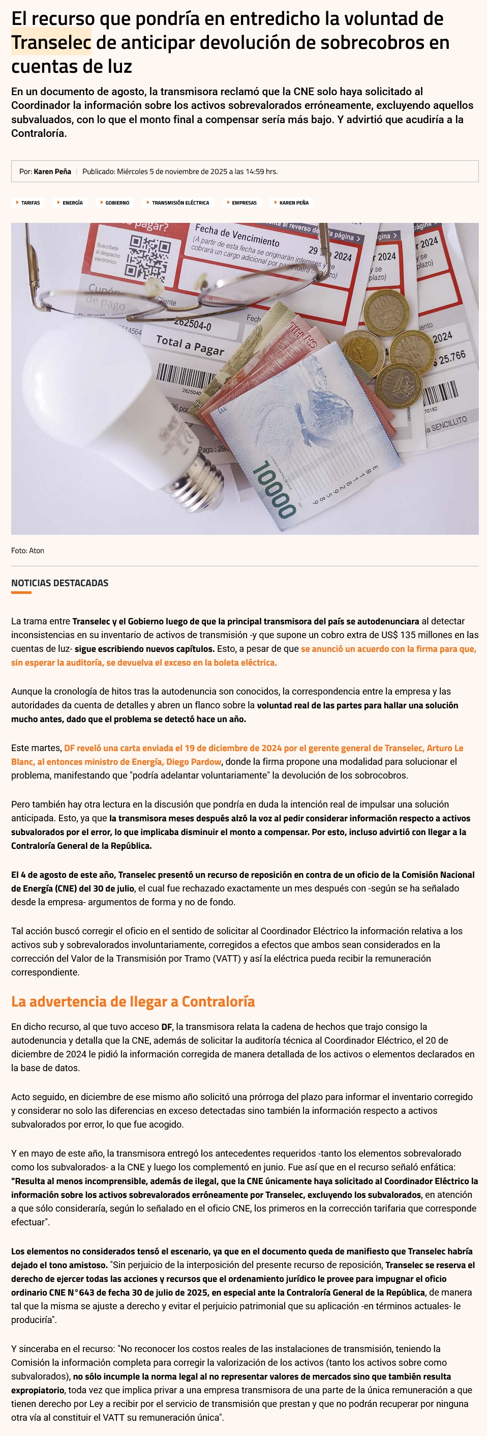 Cuentas de luz: Revelan que Transelec exigió que se considerara dato que ajustaría cifra de devolución - (biobiochile online)