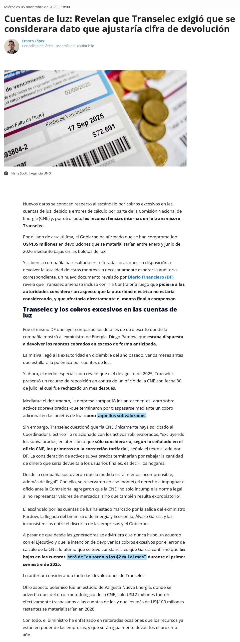 El recurso que pondría en entredicho la voluntad de Transelec de anticipar devolución de sobrecobros en cuentas de luz - (DF Online)