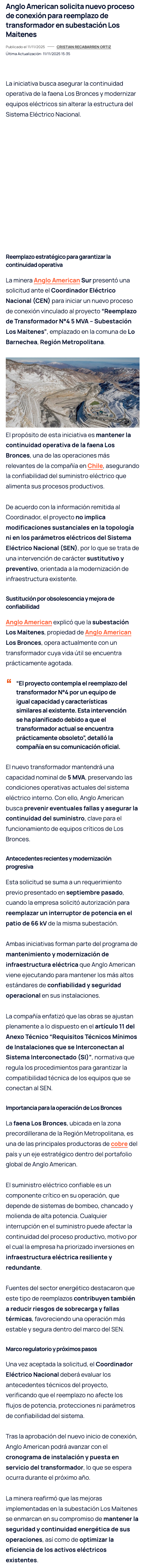 Anglo American pide nuevo inicio de conexión para la continuidad operativa de subestación Los Maitenes - (electromineria.cl)