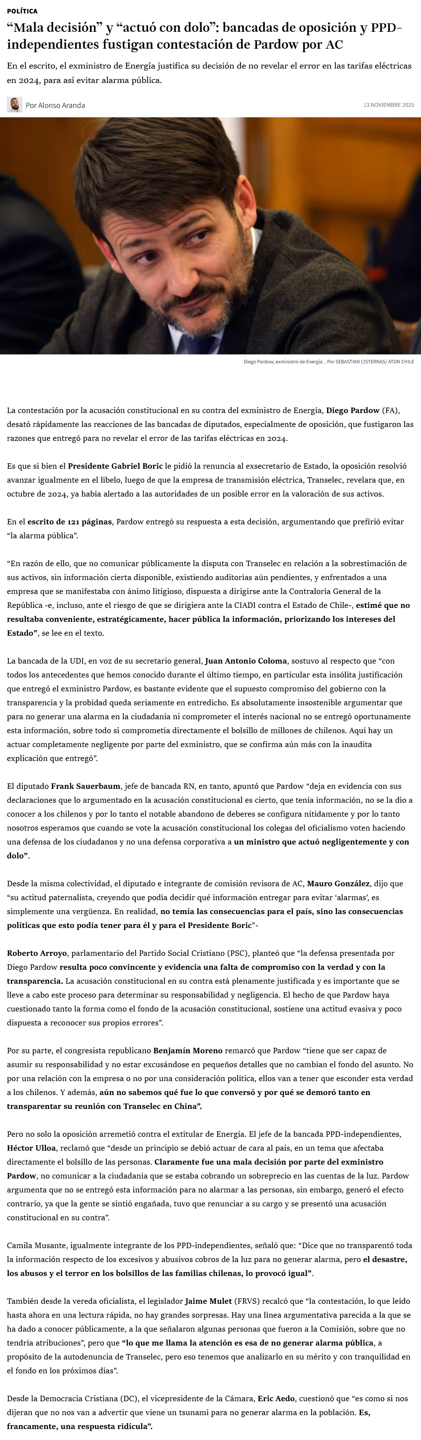 Gana fuerza entre parlamentarios la idea de que Pardow actuó con negligencia, tras conocer la respuesta del exministro a la acusación - (DF Online)