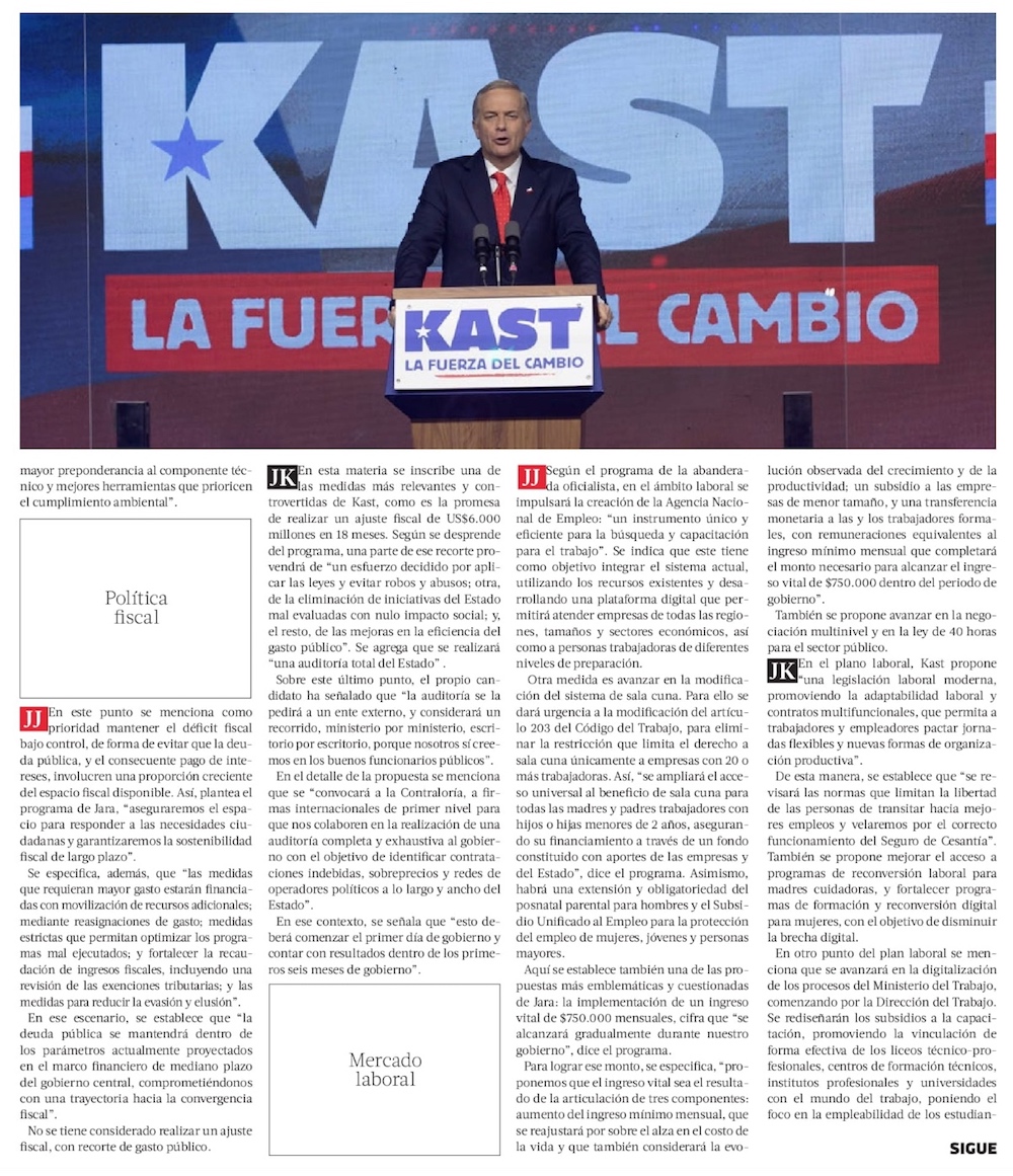 Kast contempla recorte fiscal, rebaja tributaria e impulsar facilidades regulatorias - (Diario Financiero)