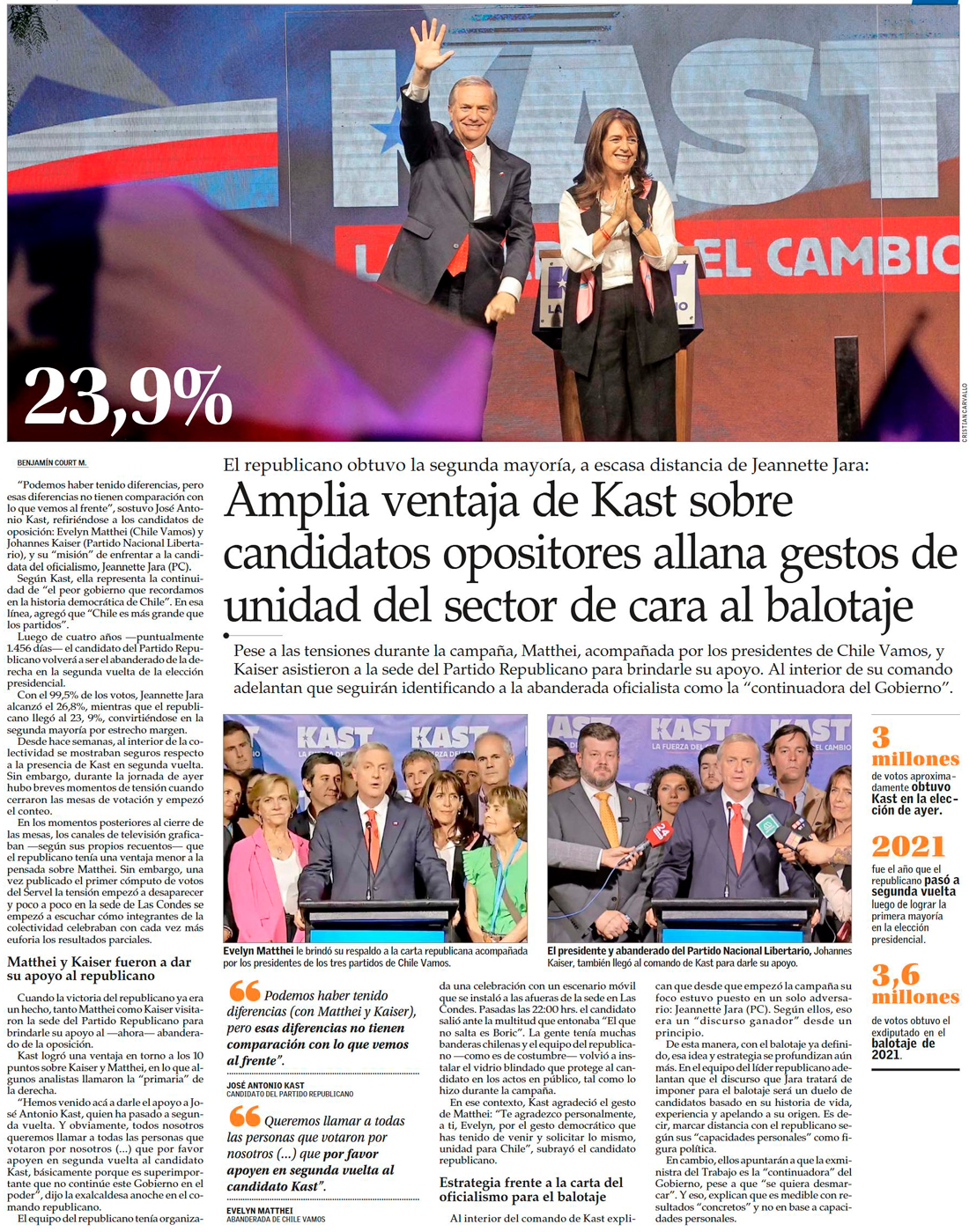 Kast triunfa en siete regiones, Jara gana en cinco y Parisi lidera en el norte del país - (El Mercurio de Santiago)