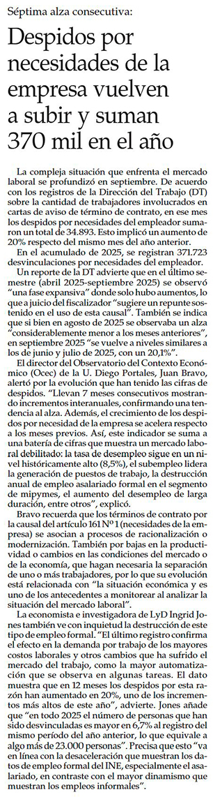 Otra señal del mercado laboral: despidos por necesidad de la empresa superan los 370 mil - (Diario Financiero)