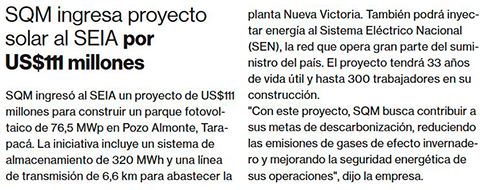 SQM presenta proyecto de energía por más de US$100 millones en la Región de Tarapacá - (La Tercera Online)
